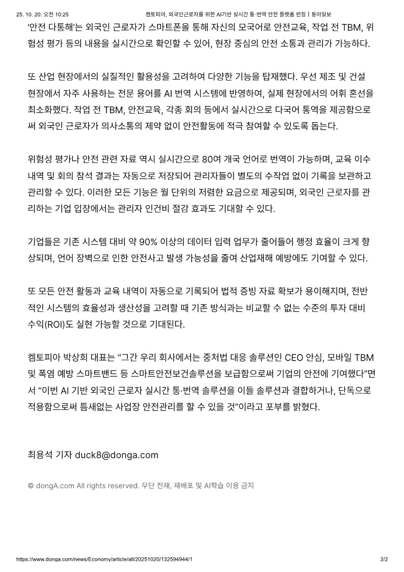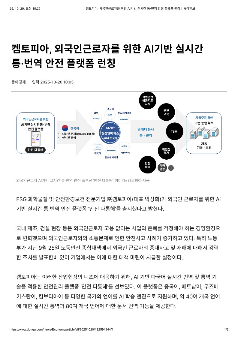 켐토피아, 외국인근로자를 위한 AI기반 실시간 통·번역 안전 플랫폼 런칭|동아일보_2.jpg