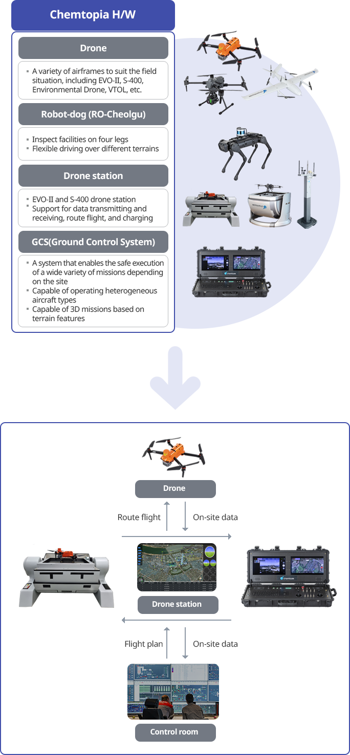 It is a solution that supports the identification of hazards to workers, work progress management, and facility leakage management with images collected by drones in the workplace. Chemtopia supports all processes from on-site measurement to site management consulting.