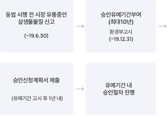 기존살생물물질 (2018년 12월 31일 까지 국내에서 유통된 살생물제품에 함유된 살생물물질)을 제조·수입하려는 자는 지정된 기간 내 (2019년 1월 1일부터 2019년 6월30일까지) 환경부장관에 기존살생물물질 신고를 수행하면, 물질승인의 유예기간을 부여 받을 수 있습니다. 기존살생물물질 신고 시 물질이 사용되는 제품의 유형이 함께 신고되어야 하며, 제품유형에 따라 최장 10년의 범위 내에서 승인유예기간을 부여 받게 됩니다. 이 기간 동안에는 승인을 받지 않고 기존살생물물질을 제조·수입할 수 있습니다.