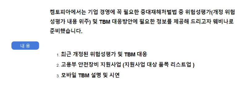 1) 켐토피아의 세미나 참석을 신청한 인원만으로 제한되어 있으므로 반드시 사전에 세미나 신청을 하여주십시오. 2) 참석인원 외에 동반인원은 참석이 불가능하오니 양해 부탁드립니다. 3) 교육 신청 및 이력확인 켐토피아고객센터 (070-4361-3051)로 연락부탁드립니다.